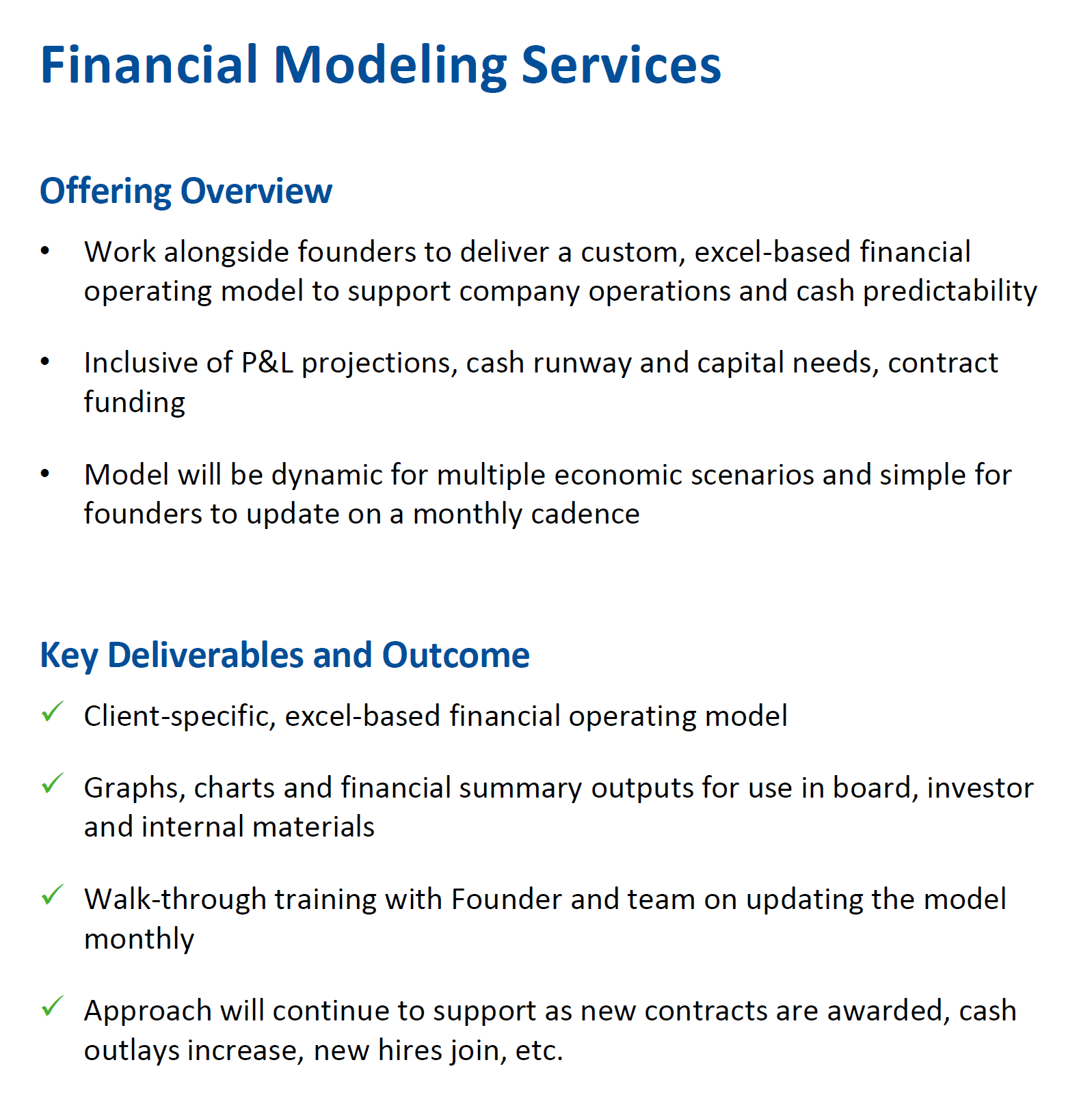 In addition to business development, proposal writing and recruiting efforts, Approach also supports founders in building first-ever financial operating models (or revamping current).